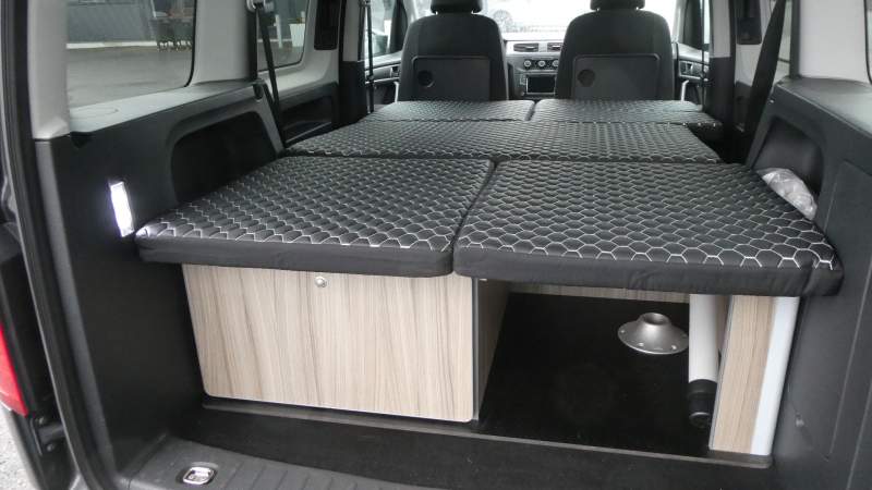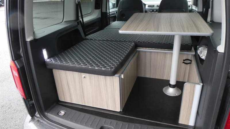 CamperKit: demonterbart bord, en utdragbar låda, blinds för samtliga rutor, dynsatts, kan kompleteras med gasol kök, tält, takbox, mm.